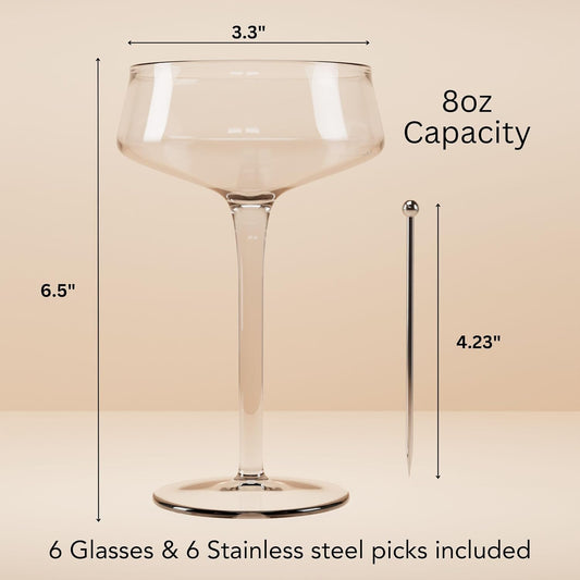 Champagne Coupe Glasses Set of 6-8oz Hand Blown Crystal Martini Glasses with 6 Stainless Steel Cocktail Picks - Versatile Tall Cocktail Glasses & Vintage Cocktail Glasses for Martini & More