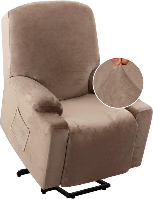 Rich Velvet Stretch Recliner Slipcovers 1 Piece Electric Power Lift Recliner Chair Cover Fitted Standard Large Power Lift Recliner with Side Pocket, Soft and Thick (Single Seat, Camel)