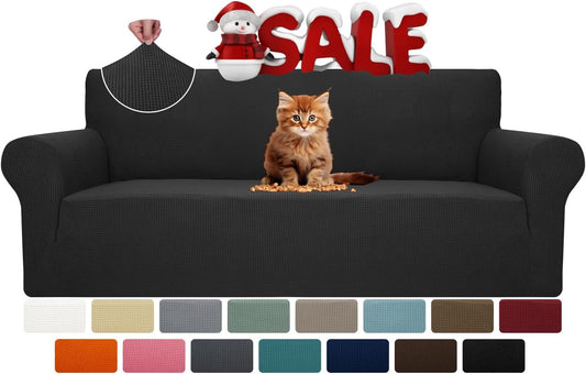 Super Stretch Couch Cover for 3 Cushion Couch, 1-Piece Universal Sofa Covers Living Room Jacquard Spandex Furniture Protector Dogs Pet Friendly Fitted (Large, Black)